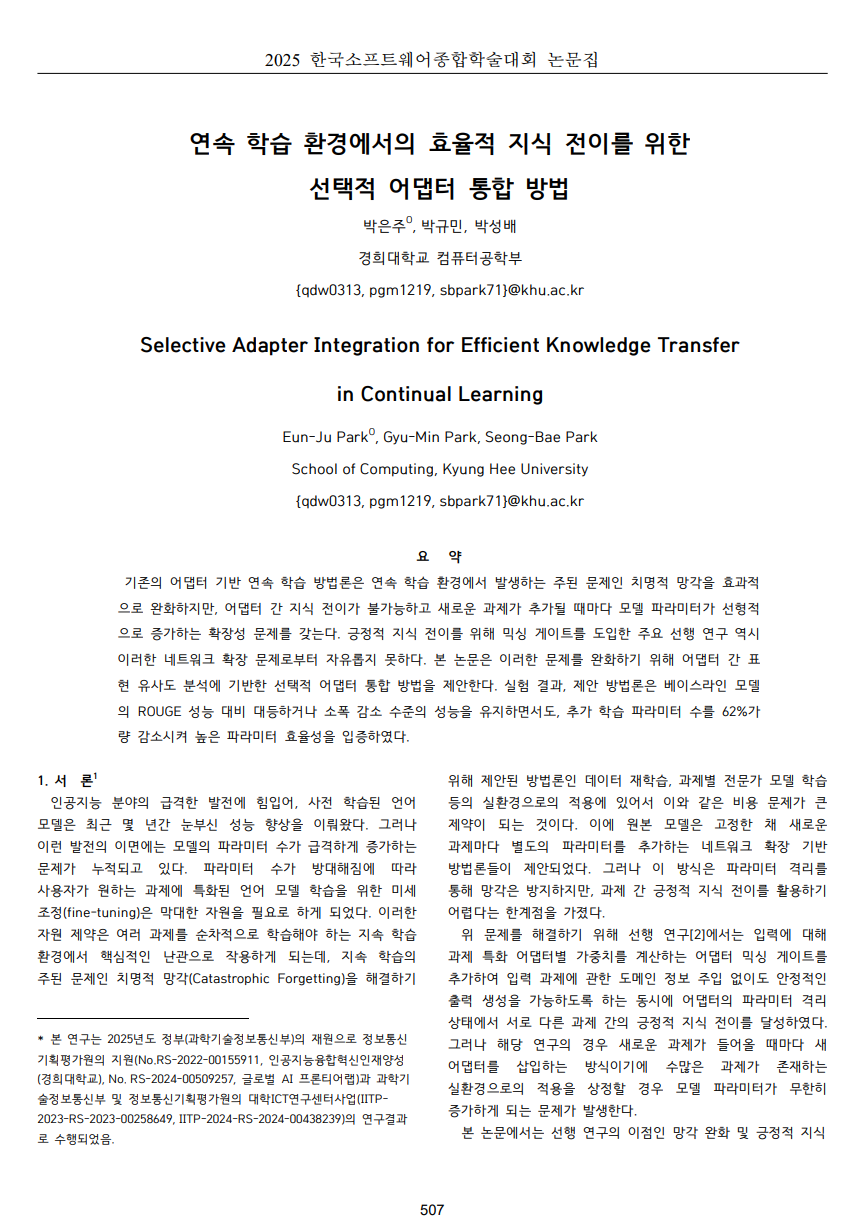 '연속 학습 환경에서의 효율적 지식 전이를 위한 선택적 어댑터 통합 방법'이라는 주제로 KSC 2025에서 최우수 논문상으로 선정되었다.