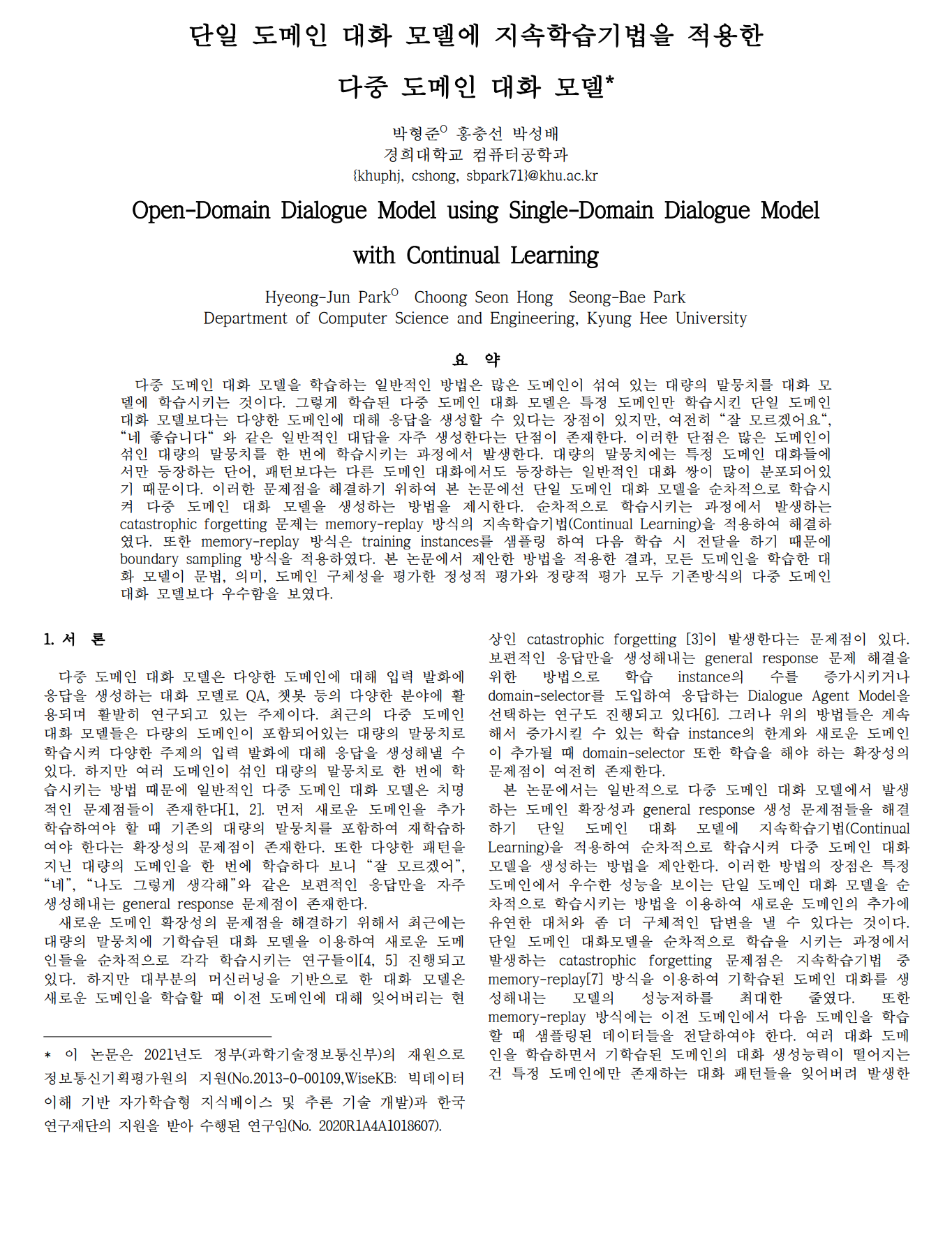 '단일 도메인 대화 모델에 지속학습기법을 적용한 다중 도메인 대화 모델'이라는 주제로 2021 한국컴퓨터종합학술대회에서 언어공학 분야의 우수발표논문상으로 선정되었다.