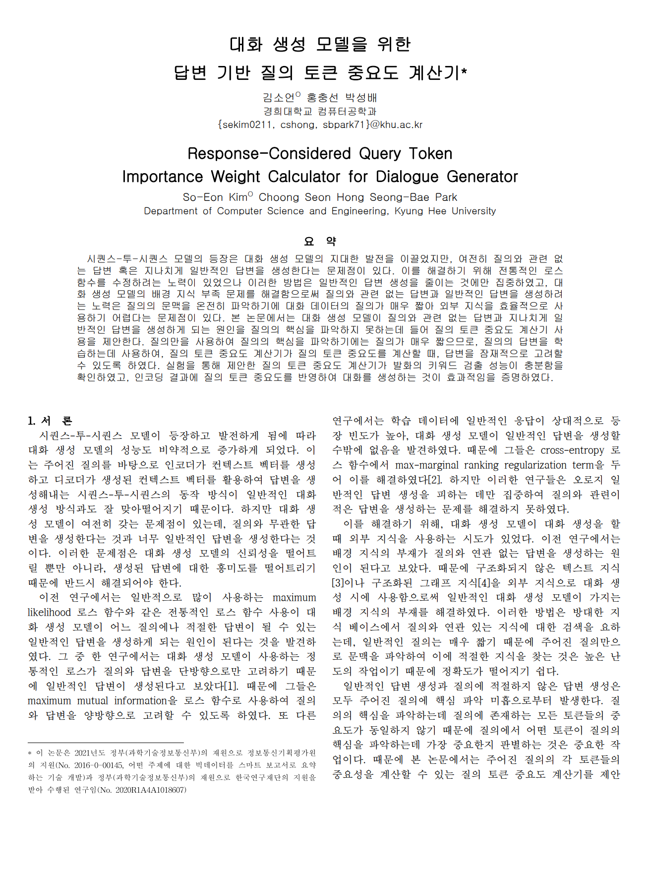 '대화 생성 모델을 위한 답변 기반 질의 토큰 중요도 계산기'라는 주제로 2021 한국컴퓨터종합학술대회에서 언어공학 분야의 우수논문으로 선정되었다.